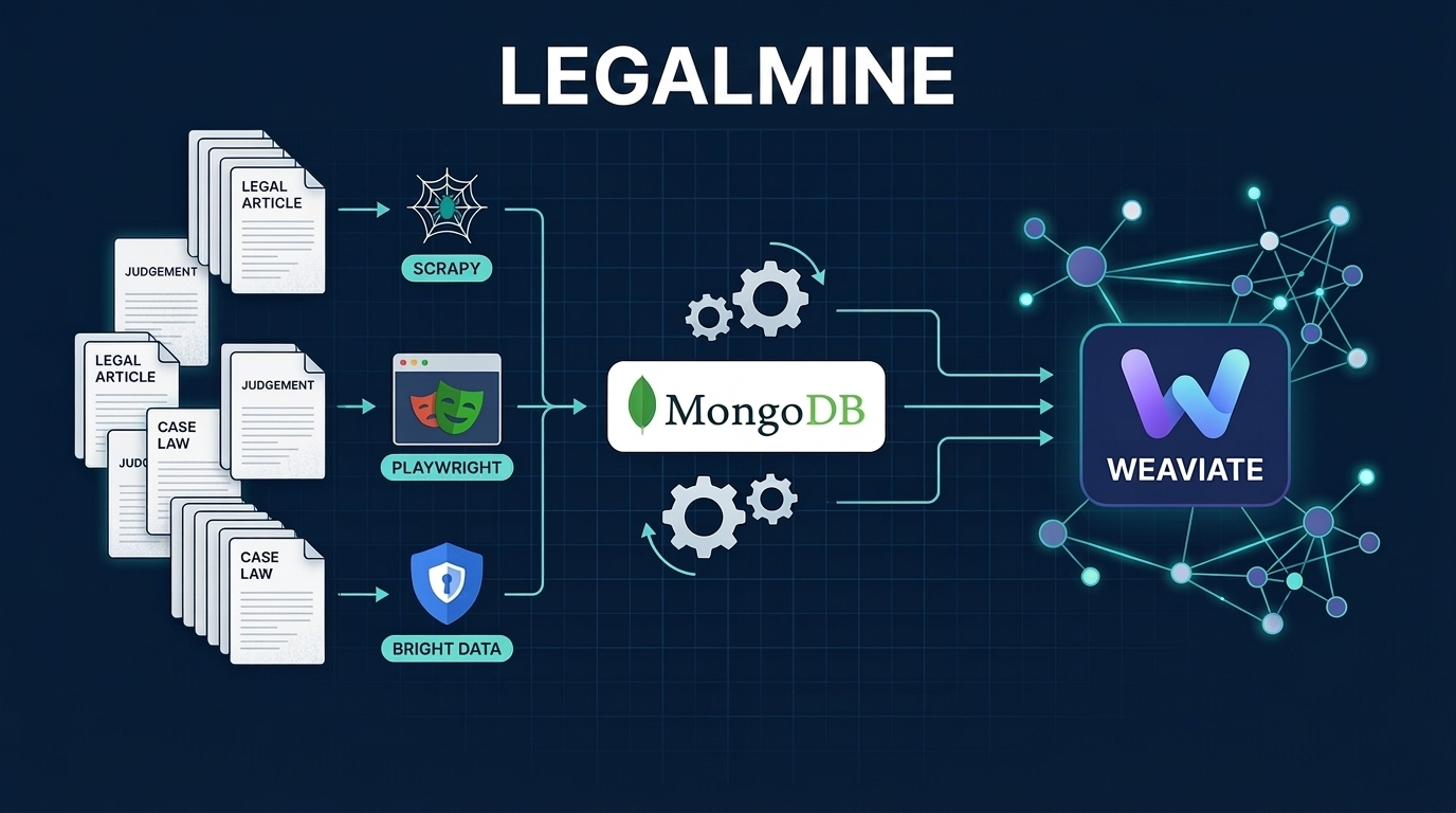 Preprocessed and normalized data was persisted in MongoDB, then embedded and indexed in Weaviate to enable semantic search, vector similarity with keyword filtering, and RAG for intelligent legal research.