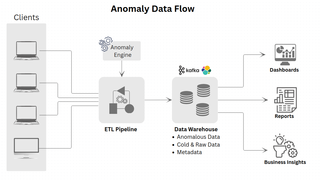 AnomalyFlow is a scalable data engineering pipeline built to streamline log ingestion and anomaly detection. It ingests data from multiple client servers into Kafka, processes it through an anomaly classification engine, and routes the results accordingly publishing anomalies to hot storage (Kafka and Elasticsearch) for real-time analysis, while directing non-anomalous data to cold storage for long-term retention. Designed to enhance analytical capabilities, AnomalyFlow brings structure, speed, and intelligence to large-scale log processing systems.