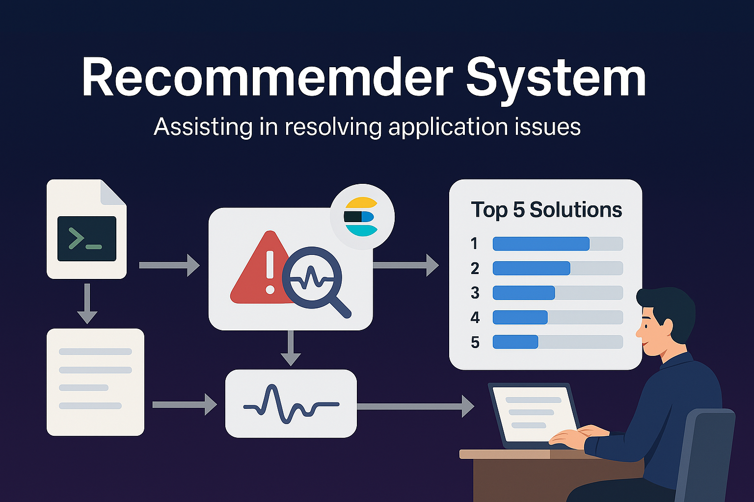 This recommender system is designed to assist in resolving application issues by analyzing error logs and providing context-specific solutions. When an error log is generated, it is first classified as normal or anomalous. If identified as an critical anomaly, the system searches across business documentation, historical group discussions, and pre-configured resolution data stored in Elasticsearch to suggest the most relevant fixes. It returns the top 5 recommended solutions, each with a confidence score, enabling users to take quick and informed action to resolve critical errors efficiently.